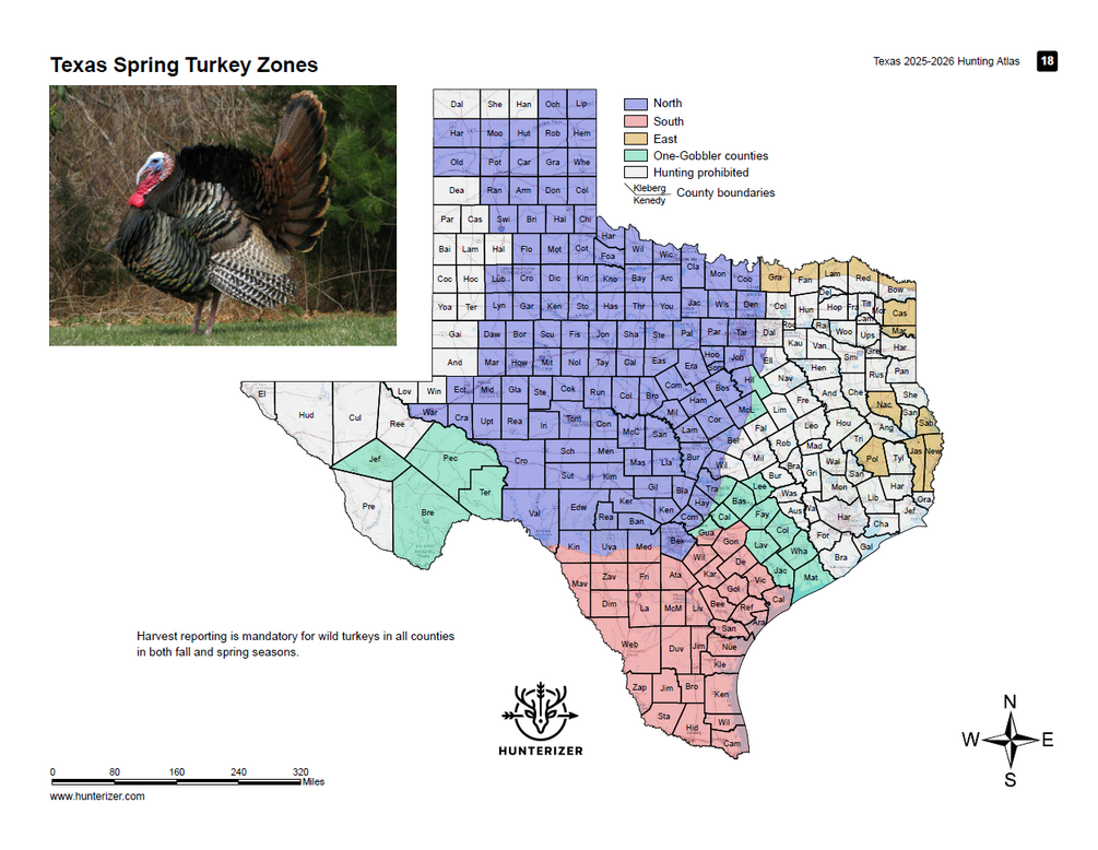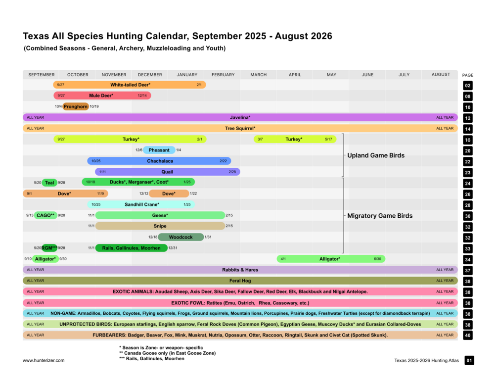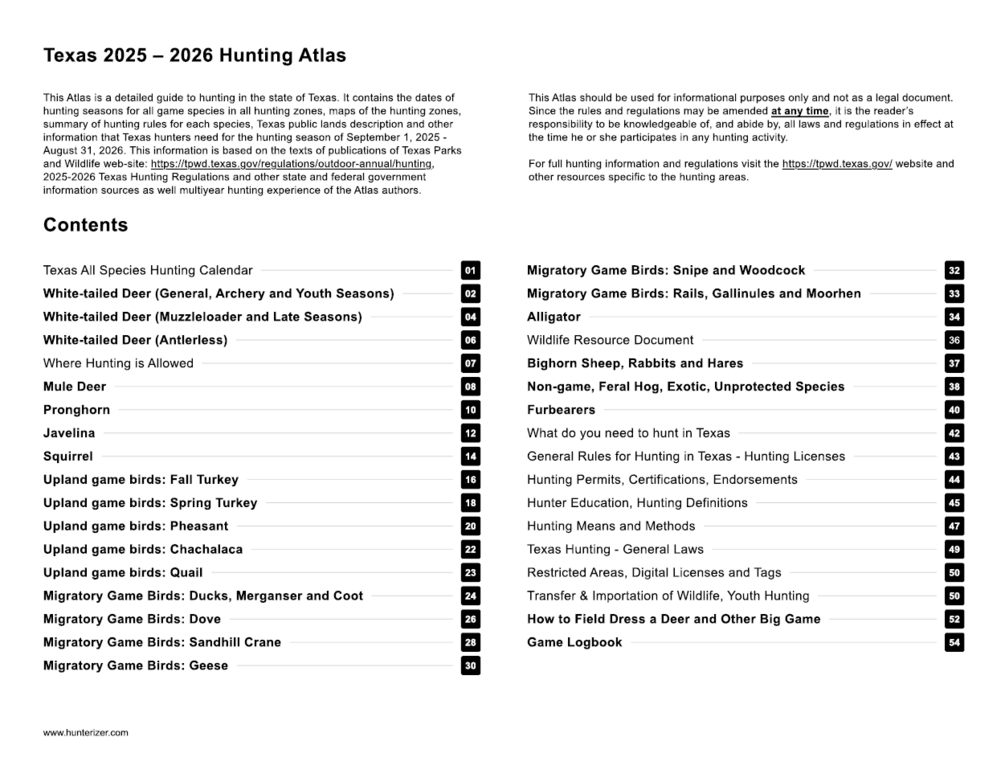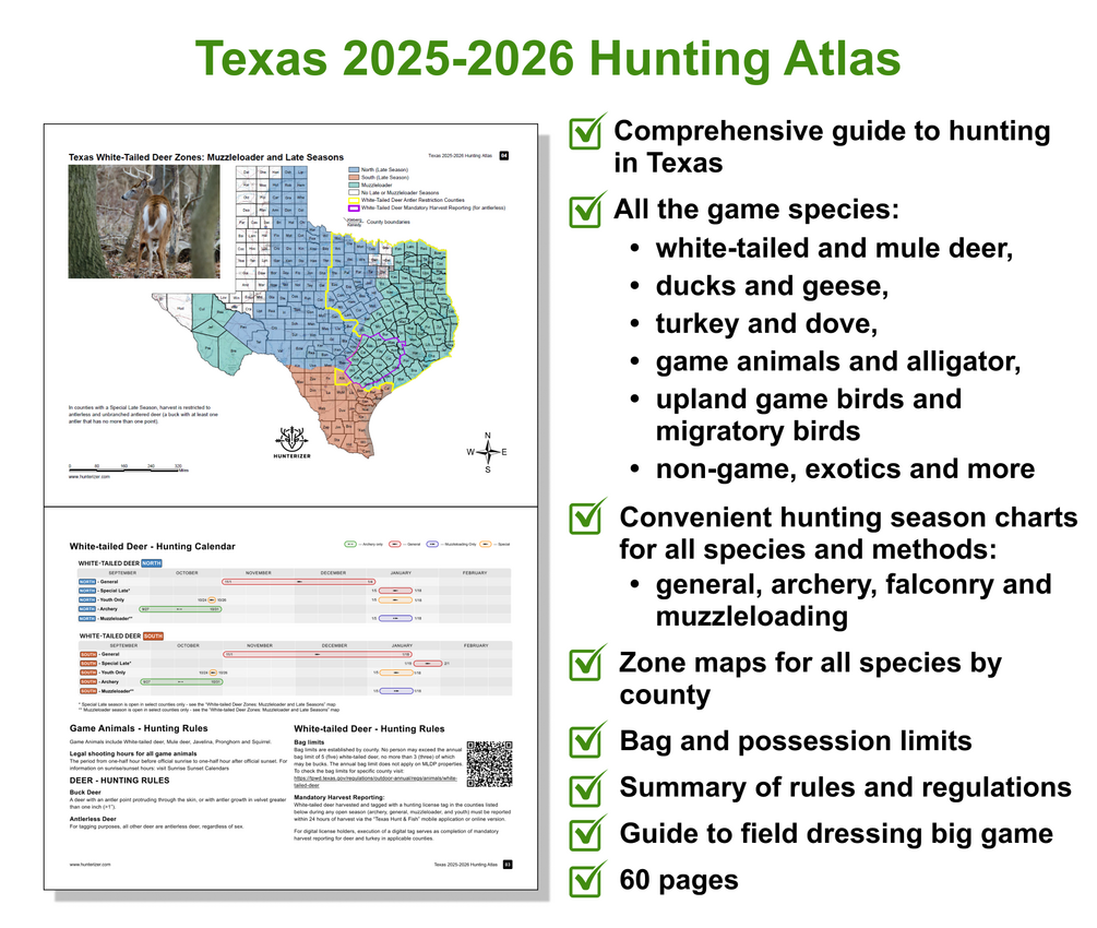 This Hunting Atlas is a detailed guide to hunting in the state of Texas in 2025-2026 license season for all legal species: deer, turkey, doves, ducks, geese, small game, javelina, alligator, exotic species and more. It contains: