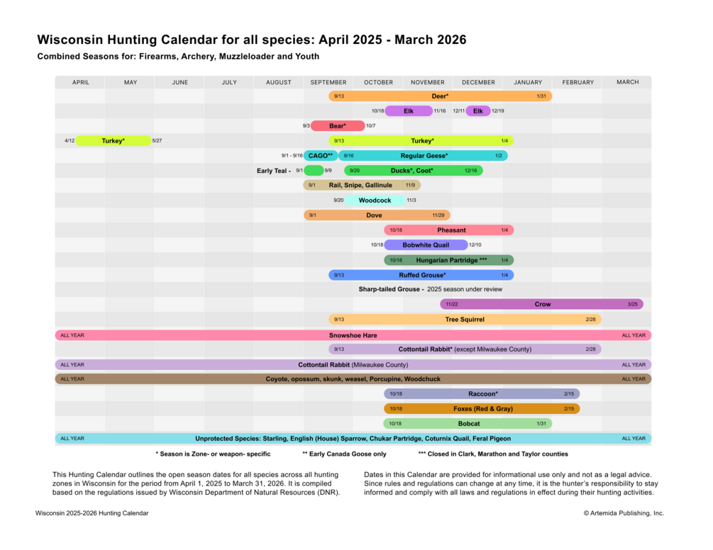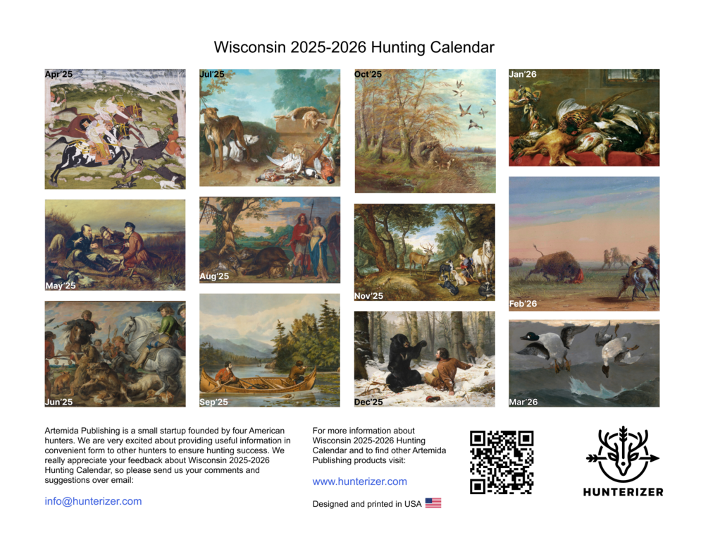 Download this calendar with 12 beautiful paintings for every month. Always know, which seasons are open in the state of Wisconsin every day of the year for Hunting Season of April 2025 - March 2026.