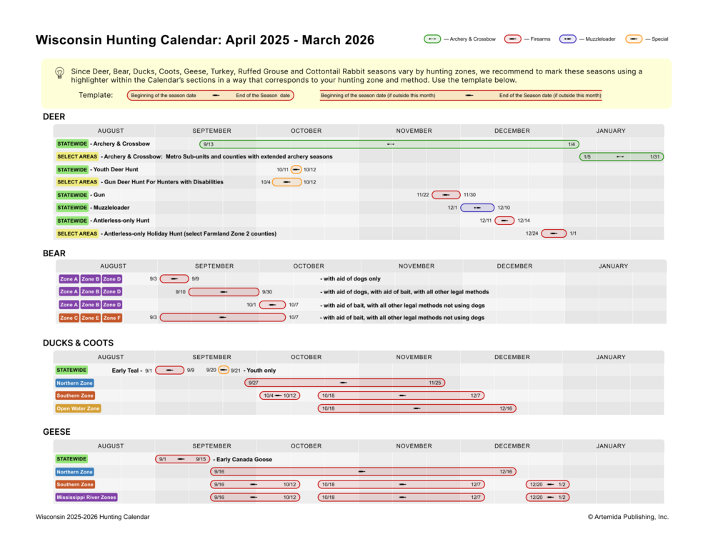 - Zone-specific charts for Wisconsin deer, bear, ducks and geese hunting seasons