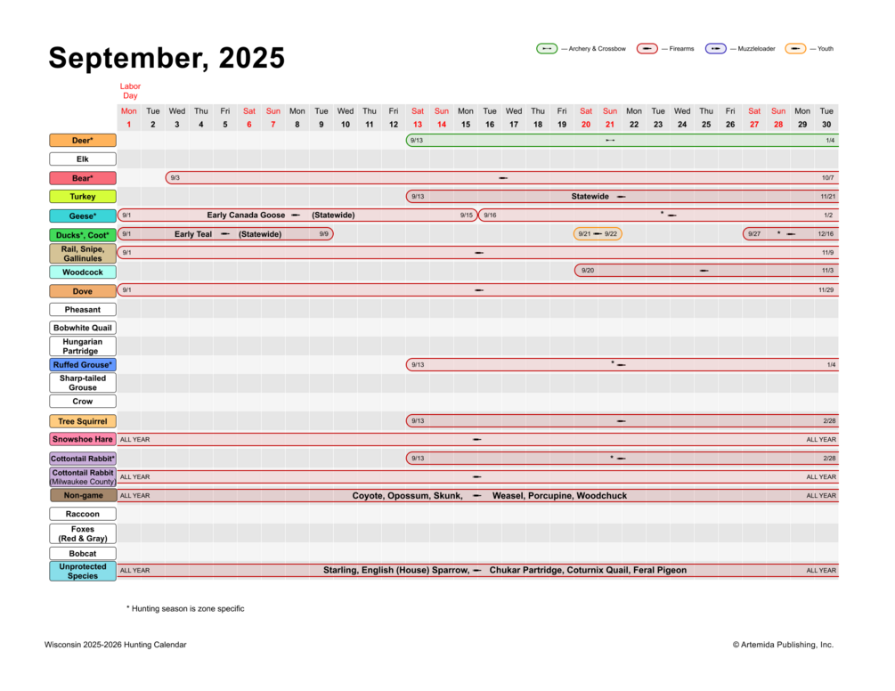 - Animal-Specific Calendars: Detailed calendar for Wisconsin hunting seasons for all species including deer, bear, waterfowl, upland game birds, furbearers and more. For every day know exactly which species to hunt to stay compliant with regulations.